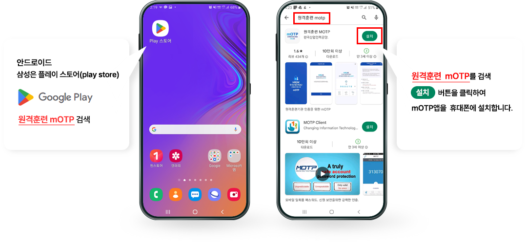STEP 01 사용하는 휴대폰(스마트기기한정)에 따라 삼성은 플레이 스토어(play store), 애플은 앱스토어(App store)에서